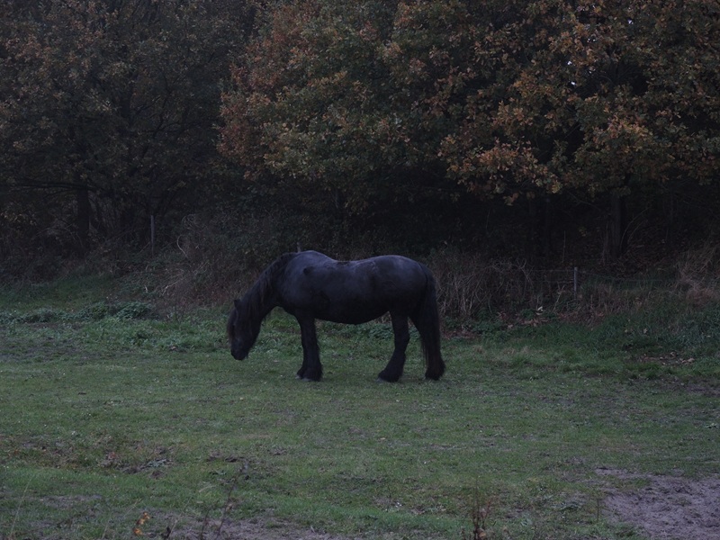 Het Zwarte Paard trekt zich terug in de rust van de herfstige weide...
